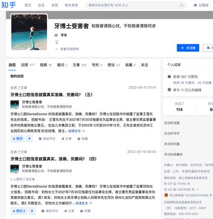 或許正是因為這種情況,牙博士的醫患矛盾並不少見。《港灣商業觀察》留意到知乎上一位網名叫“牙博士受害者”的貼文。其中有的文章已經顯示為內容無法顯示,有的內容觸目驚心。