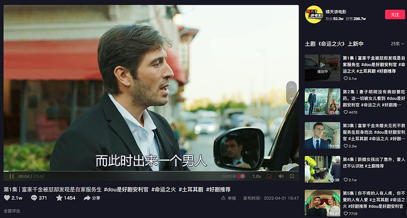 在當時,可能鮮有人想到,抖音還會和土耳其有什麼樣的額外關聯。2020年,大批影視解説類賬號在抖音崛起,雖然拆解國產劇及英美日韓劇是主流,但也有一部分剪刀手注意到了相對小眾的土耳其劇。
