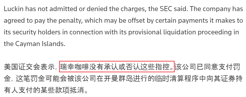 路透社《 Luckin Coffee to pay $180 mln penalty to settle accounting fraud charges -U.S.SEC 》