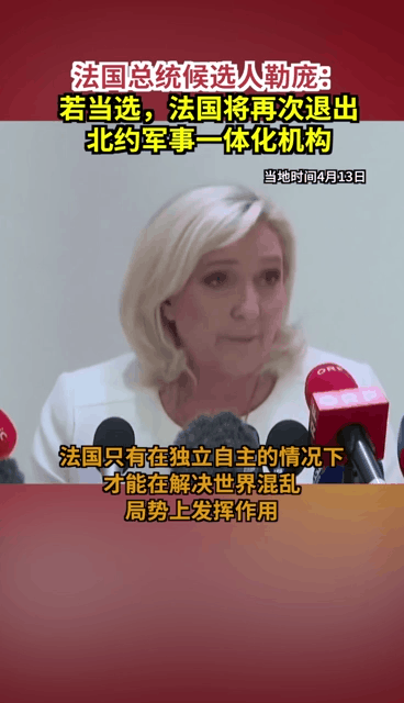 ▲2022年4月13日,法國極右翼政黨“國民聯盟”總統候選人勒龐表示,如果她在大選中獲勝,法國將退出北約軍事一體化機構。勒龐同時表示,不應再向烏克蘭提供武器。