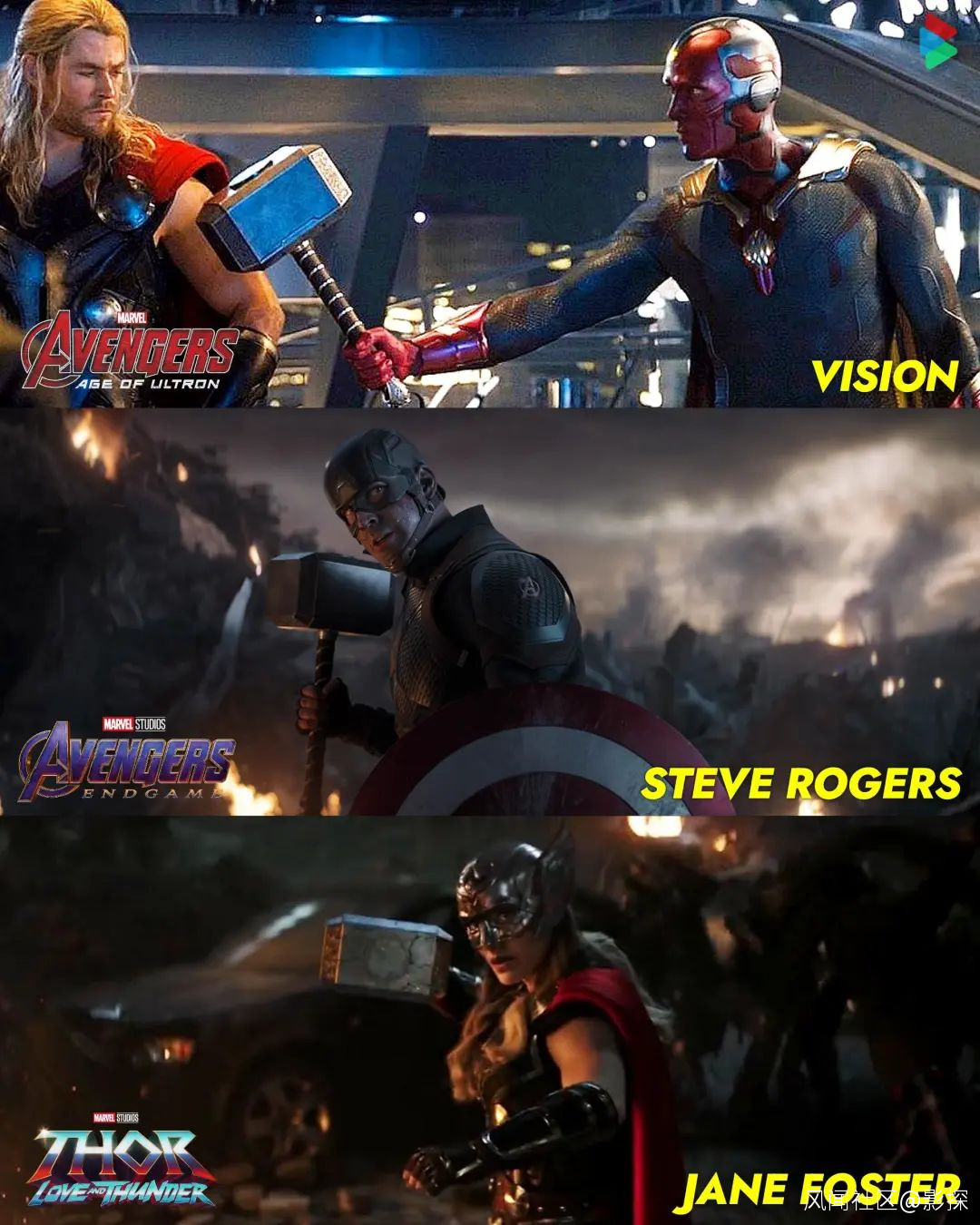 前後三個形象,分別致敬了漫畫經典、《雷神》電影和青年雷神造型。