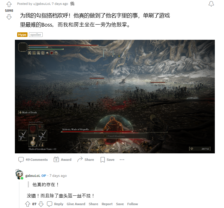 在Reddit的《艾爾登法環》板塊,時不時就會有用户發佈一些“感恩貼”,向那些在聯機模式中協助自己打倒Boss的玩家致謝。