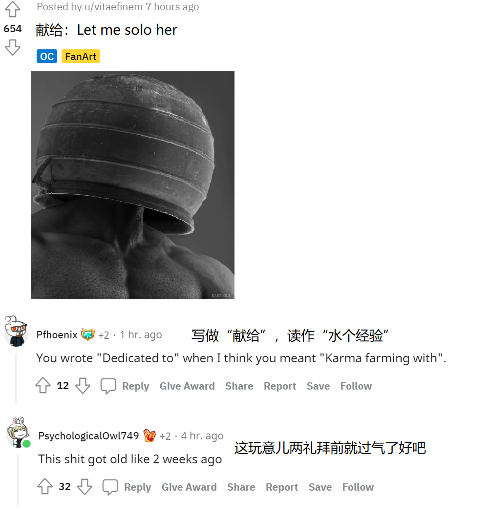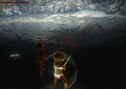 除此以外,受到壺頭哥的啓發,一些“惡搞行為藝術家”也應運而生,他們有的叫作“Let you solo her”(你來單刷她),會在受到召喚後乾坐在一旁,看着房主受苦單挑女武神;有的則叫作“Let me solo you”(我來單挑你),專門在女武神門口入侵其他玩家;還有的叫作“Let her solo me”(讓她單刷我),會在Boss戰開始後直挺挺地走向女武神,緊接着被砍翻在地。