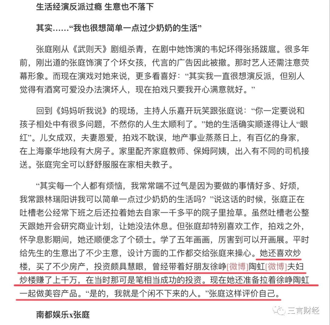 這篇報道稱,張庭喜歡炒樓,買了不少房產。而且她認為自己投資頗具慧眼,還曾經帶着好朋友徐崢陶虹夫婦炒樓賺了上千萬元。另外,張庭還表示,準備拉着徐崢陶虹一起做美容產品。