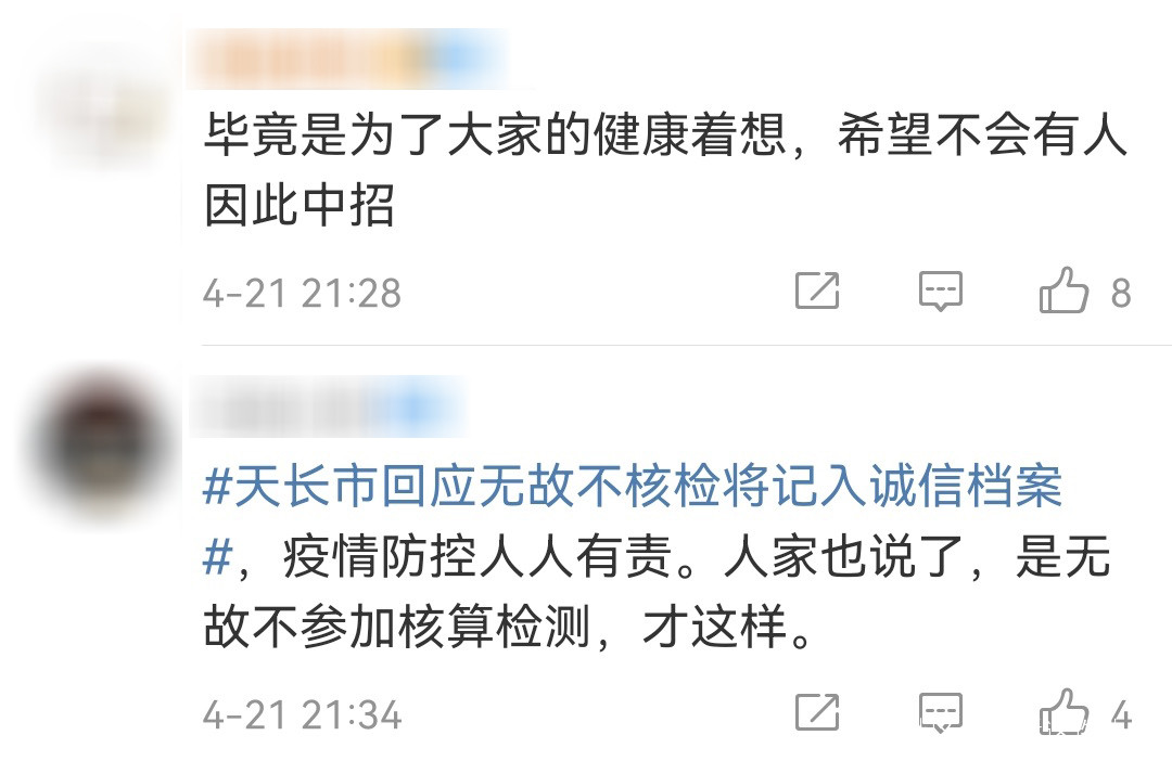 21日,天長市政府做出回應:目前,沒有人因無故不參加核酸檢測被記入誠信檔案。通告系疫情防控指揮部發出,該公告的出發點是加強管理。