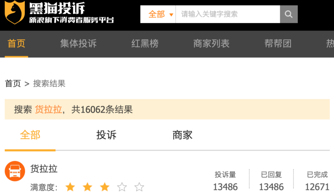 目前,在黑貓投訴上,貨拉拉接到了一萬六千多條投訴,據不完全統計,約10%的投訴來自C端用户,90%的投訴均來自司機端。