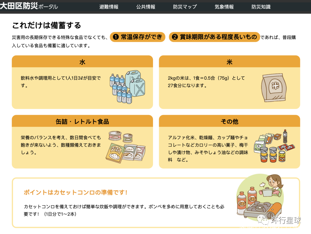 東京大田區的防災指南,明確提出要給每個家庭成員準備至少3天的糧食儲備,嬰幼兒和寵物也要配備相應的用品。因為供水可能會被切斷,飲用水和簡易一次性馬桶也是必不可少