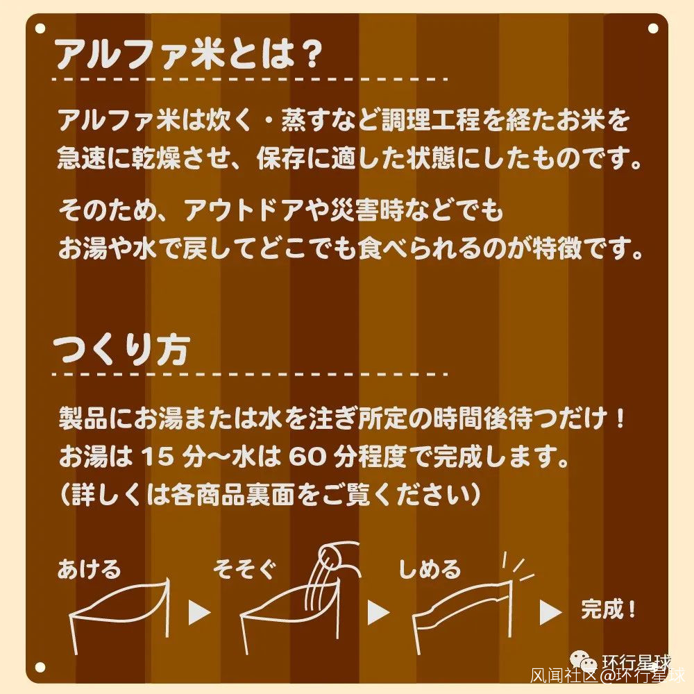 在日本,這些應急食品同樣受到户外愛好者的歡迎,尤其是阿爾法米飯製品,每袋重量只有100g。在揹包中拿出兩袋,倒入水,一頓簡易的露營午餐就解決了。一些登山用具的品牌也會用到相同的技術,生產户外食品。