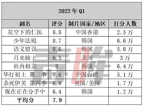 另外,海外劇的打分人數偏少,也是造成其評分普遍高於國產劇的原因,今年Q1評分前十的海外劇中,只有《少年法庭》和《社內相親》的打分人數超過了6萬。