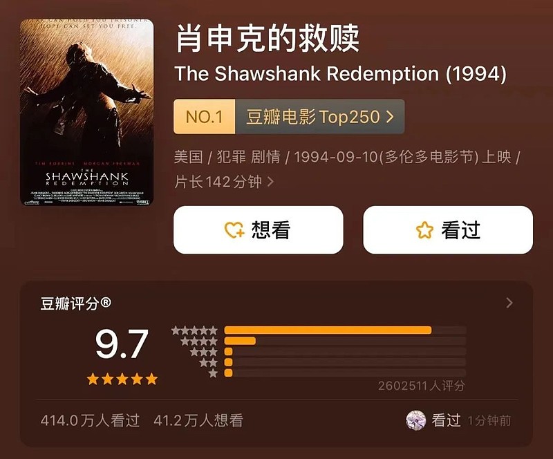 善用書影音功能的,是早期被打上“文藝青年”標籤的豆瓣核心用户,電影TOP250中以9.7分位列第一的《肖申克的救贖》,能夠獲得213萬用户打分。而熱衷看國產劇、喜歡為國產劇打分的用户,不少是隨着娛樂類豆瓣小組的崛起而湧入的。