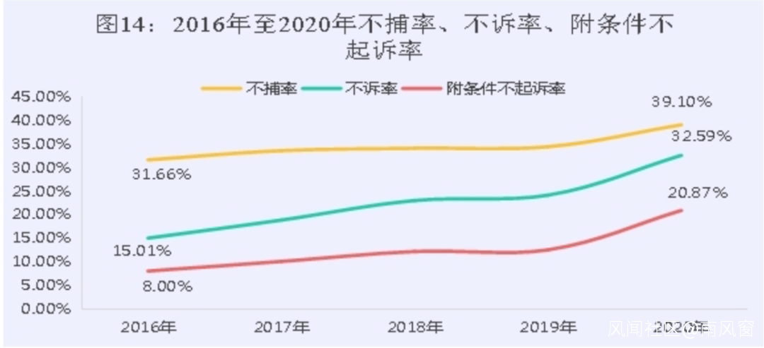 2016~2020年針對未成年人的不捕率、不訴率,附條件不訴率 來源:未成年人檢察工作白皮書(2020)