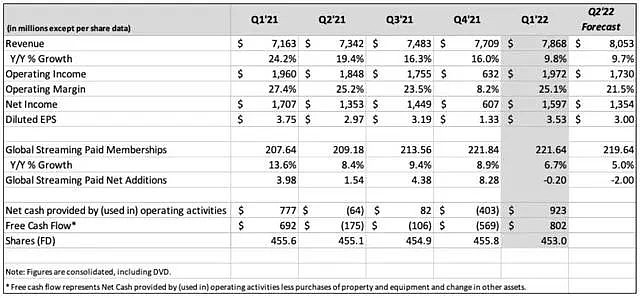 市場的失望主要源自用户的負增長。2022年一季度Netflix的全球付費用户數流失20萬,遠低於公司預期的新增250萬,更低於市場普遍預期的273萬,是Netflix付費用户數近十一年來的首次負增長,這對於收入基本來自付費用户數的Netflix來説,是一次巨大的衝擊。