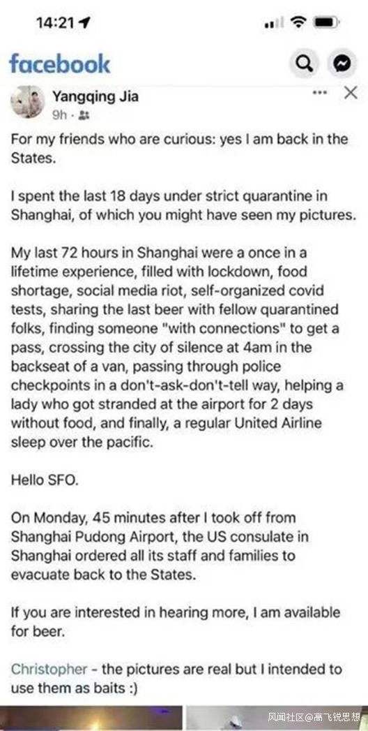 一個是阿里巴巴技術副總裁賈揚清利用抗疫政策漏洞、自己的智慧和人脈關係,逃離上海,去了美國,並在Facebook社交平台上用英文發表動態,用“strict quarantine(嚴格管制)”、“lockdown”(活動或行動限制)、“foodshortage(食物短缺)”等符合西方語境的關鍵詞別有用心地描述我國抗疫政策,給西方妖魔化中國遞刀子,與武漢抗疫時期方方撰寫的《武漢日記》異曲同工。