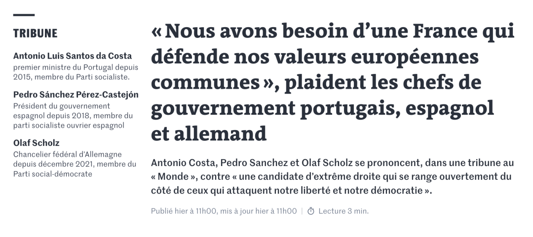 今日,大選的正式競選活動已經接近尾聲。歐洲各國領導人紛紛發聲,表示對埃馬紐埃爾·馬克龍的支持。德國總理肖爾茨、西班牙首相桑切斯和葡萄牙總理科斯塔本週四在法國《世界報》發表聯合評論文章。