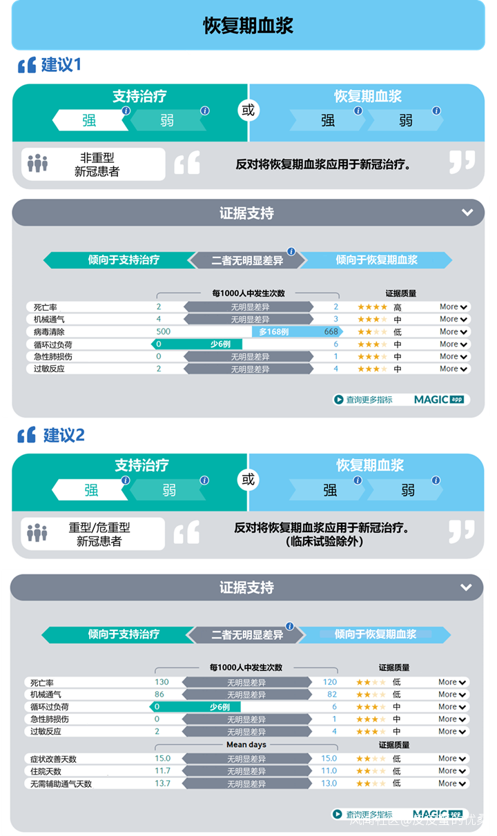 現有證據表明,在重型及危重型新冠患者中,恢復期血漿對死亡率、機械通氣、症狀改善時間、住院時長等關鍵指標上無重要作用(低/非常低明確性),儘管現有數據提示其可能不會提高輸血相關急性肺損傷(中等明確)、循環超負荷(中等明確)、過敏反應(低明確性)的發生風險,血製品相關的風險永遠無法忽視。因此,指南建議除臨牀研究以外,不對重型及危重型患者使用恢復期血漿。