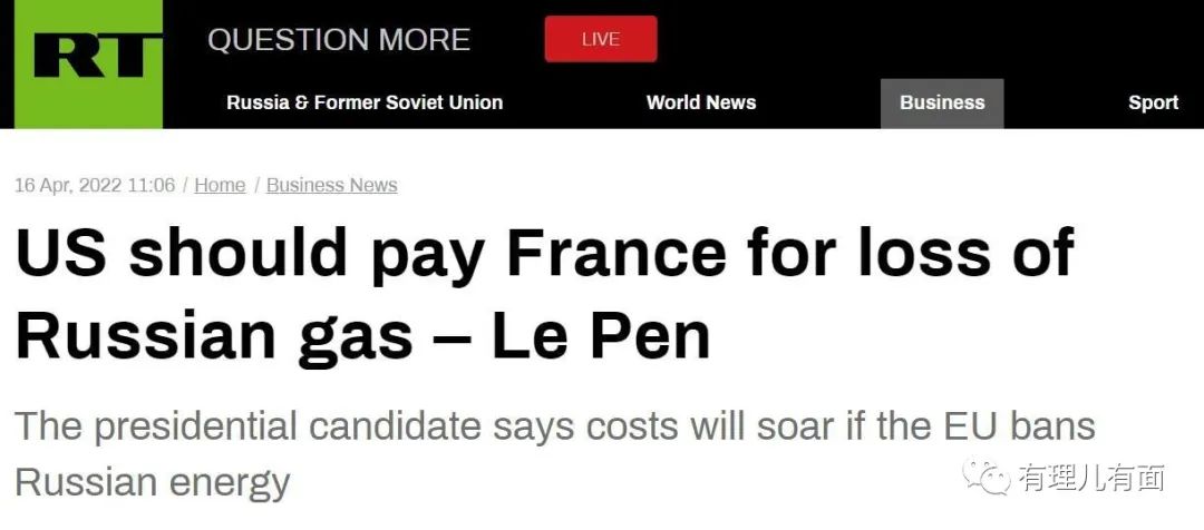 4月16日,勒龐在接受法國“BFMTV”採訪時説,如果歐盟實施禁止進口俄羅斯能源,美國應該賠償法國的損失。