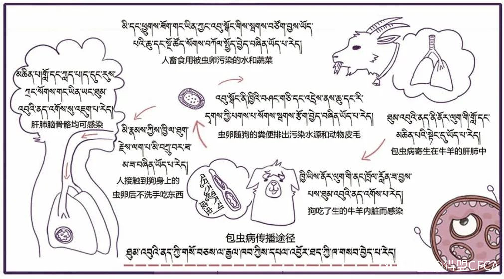 狗是包蟲最重要的中間寄主,它們會寄生在犬的小腸裏面,對狗本身沒有任何影響,但狗的糞便中就可能會包含大量的蟲卵,牧民接觸到狗就有可能會感染。
