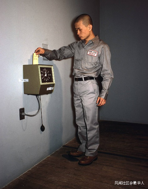 在作品《打卡》中,他不僅把自己關在籠子裏一年,他的枕邊有一個鬧鈴的裝置,提醒他每隔一個小時打一次卡。