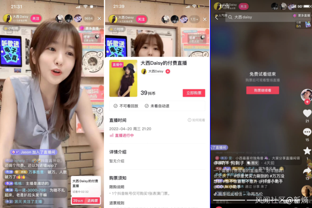 同一時間,一位擁有60萬粉絲的音樂博主大西daisy,在抖音開啓了自己個人主播生涯的第一次付費直播。所謂抖音付費直播,用户只可免費觀看2分鐘,之後需支付相應觀看費用(抖幣)。