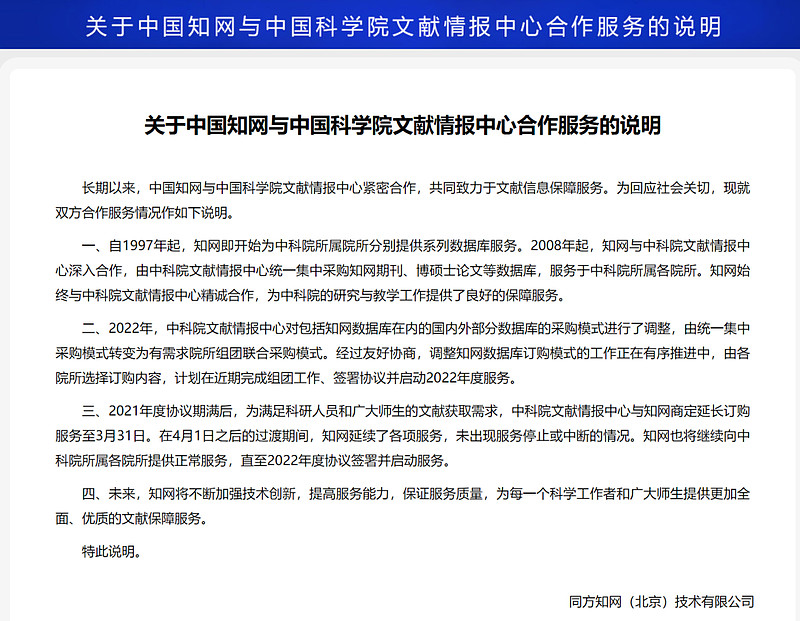 隨後知網方面也對此事進行了回應,稱將繼續提供正常服務,“直到2022年協議簽署並啓動服務”,言下之意即是否訂購仍有迴旋空間,具體價格和數據庫內容取決於今年的協議。