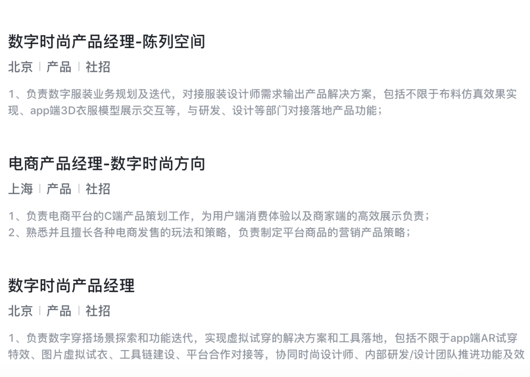 字節的數字時尚業務,在後期所連通的自有業務並不少。Tech星球發現,字節在近期開始招募的部分數字時尚產品經理崗位,明確要求負責數字穿搭場景探索和功能迭代,實現虛擬試穿的解決方案和工具落地,包括但不限於app端AR試穿特效、圖片虛擬試衣。並深入瞭解渲染引擎、數字人、虛擬偶像等發展趨勢,可見該項目欲連通自有多個業務進行協同發展。