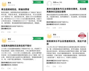 《港灣商業觀察》檢索黑貓投訴平台顯示,截止4月24日,搜索“國美電器”共計11755條投訴量,其中近30天投訴量114條,已完成27條;搜索關鍵詞“真快樂”共計2552條結果。其中消費者投訴問題多為虛假宣傳、拒絕退款、“真快樂豆”無法使用、拒不發貨、招商欺詐、商品質量等問題,投訴者包括平台使用者及平台商户。