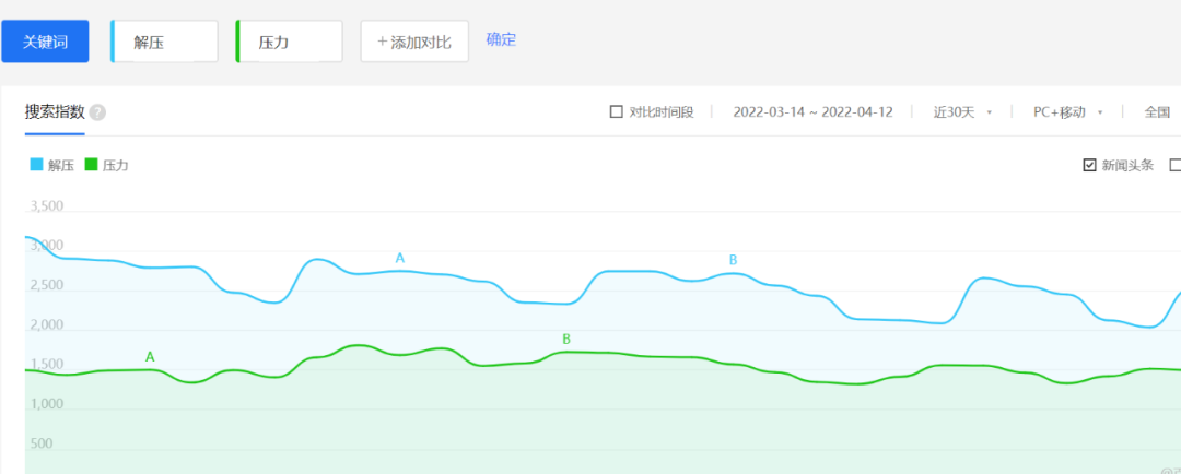 在百度指數,對比“壓力”和“解壓”的曲線圖可以看出,相比於“壓力”本身,年輕人更加關注“解壓”。而且根據資訊指數,關鍵詞“解壓”同比增長78%,環比增長31%。