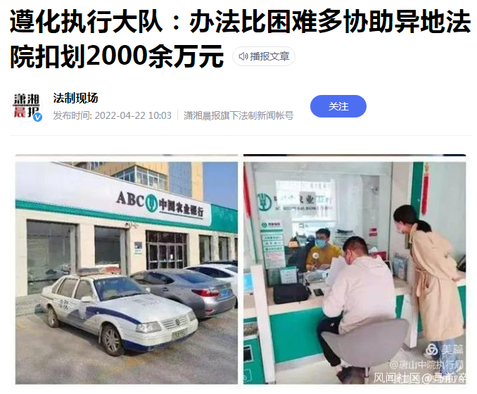 從這則新聞可以看到,法院到異地執行,必須強調共同的上級很重視,得到協助之後還要表示感謝。反過來説,如果沒有共同的上級催促,沒有人情關係協助,異地順利執法是個小概率事件。