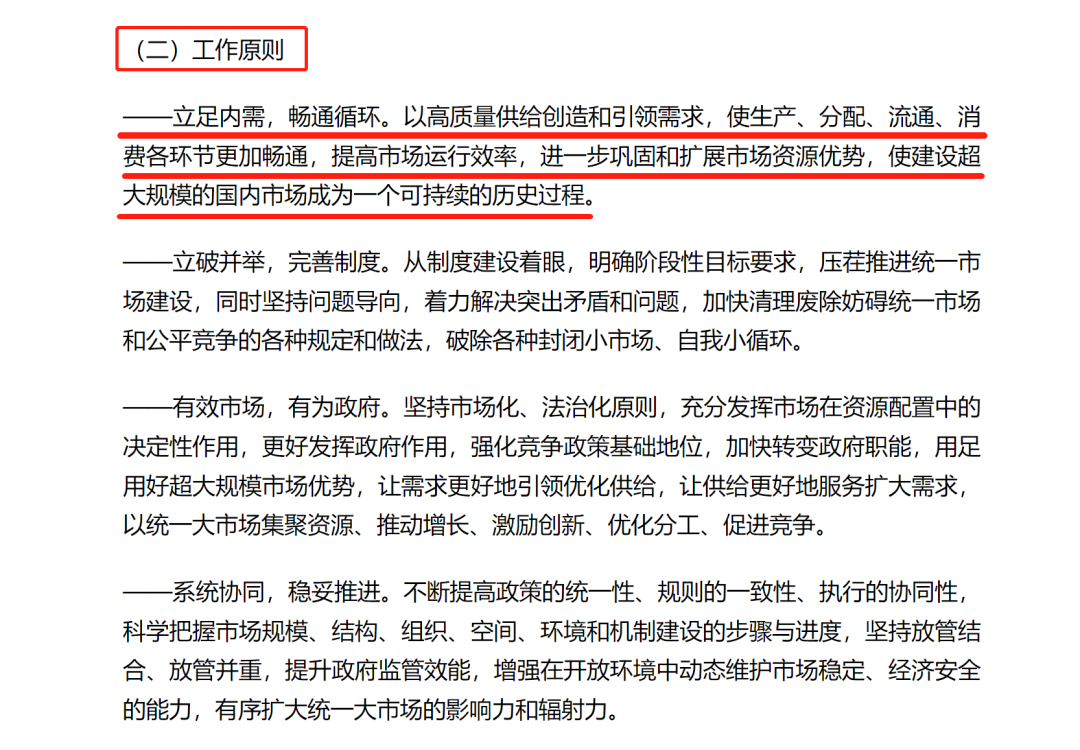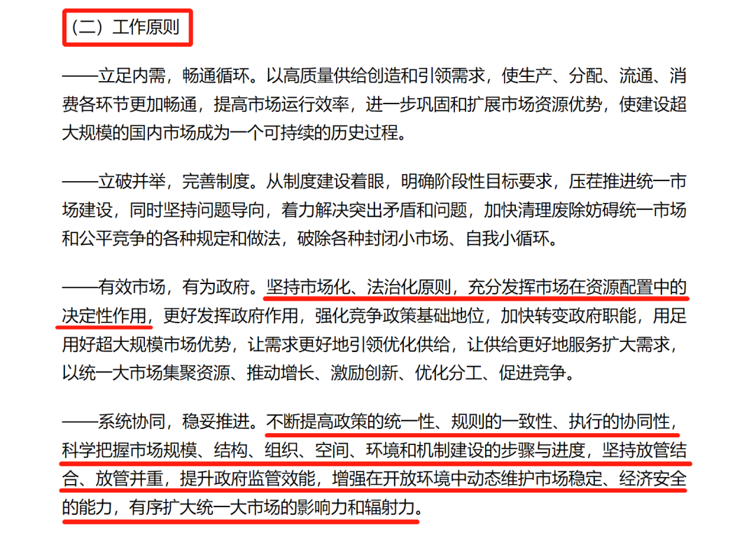 工作原則的第三條重申堅持市場化、法制化原則。第四條強調提升政府監管效能。這兩條也可以歸併到一起。因為統一大市場打破各地的保護之後,最直接的衝擊,就是大企業快速再消滅一批低效率的小企業。效率和人情味很難共存,何況這些小企業所謂的人情味,主要原因也是用模糊的市場標準掩蓋了更高的收費。但是,一旦大企業快速擴展,就會有濫用壟斷地位和政商勾結的可能性,所以監管必須加強。