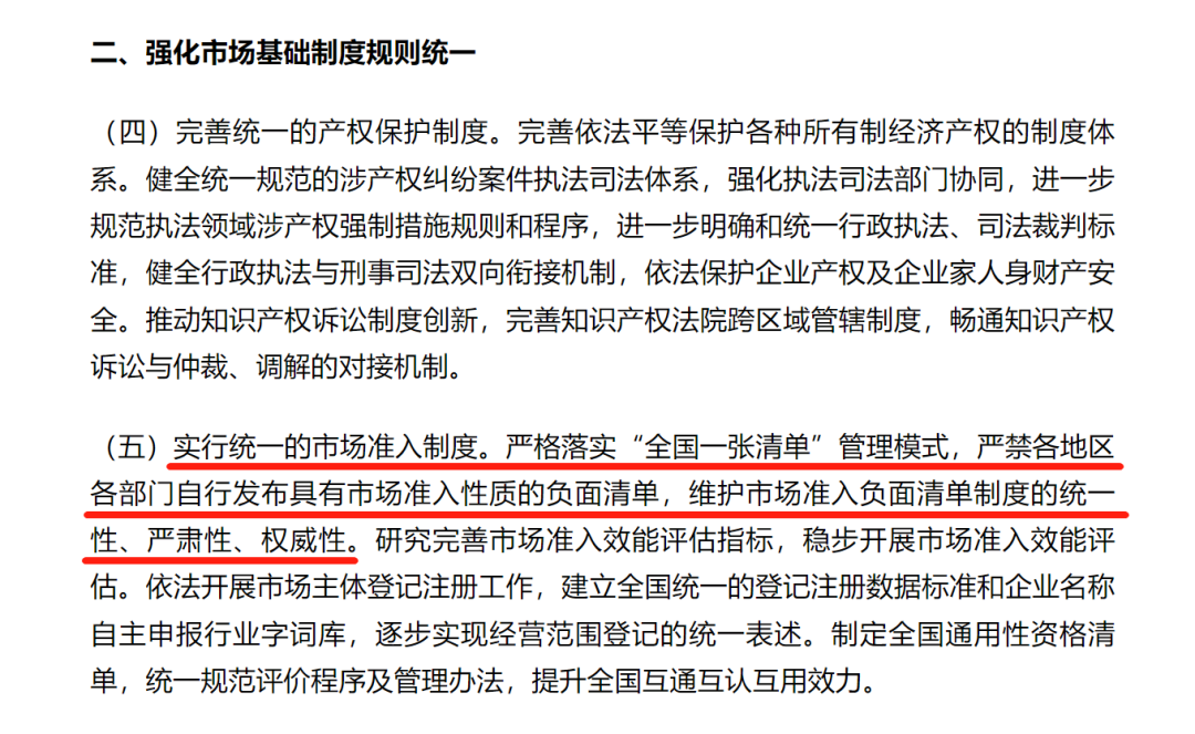 再下一條措施,是實行統一的市場準入制度。嚴格落實“全國一張清單”管理模式,嚴禁各地區各部門自行發佈具有市場準入性質的負面清單。裏面有個有意思的點,是“開展市場主體登記註冊工作,建立全國統一的登記註冊數據標準和企業名稱自主申報行業字詞庫,逐步實現經營範圍登記的統一表述。”