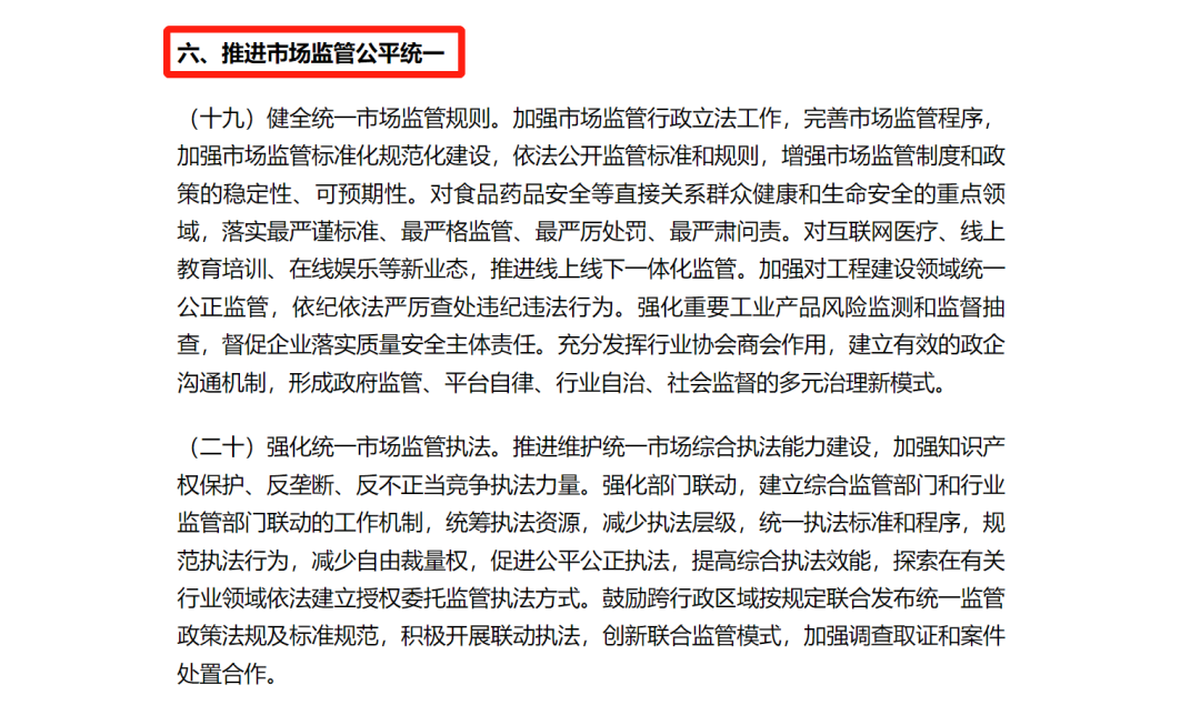 第七章是進一步規範不當市場競爭和市場干預行為。其中第一條就是反壟斷。如果只是反壟斷,反不正當競爭,本來可以歸入上面加強市場監管的部分。但是,這次的政策是推出統一大市場,所以我前面反覆提醒的,對各地中小企業來説,統一大市場未必是好消息,很多領域會快速被大企業佔領,直到出現壟斷現象。