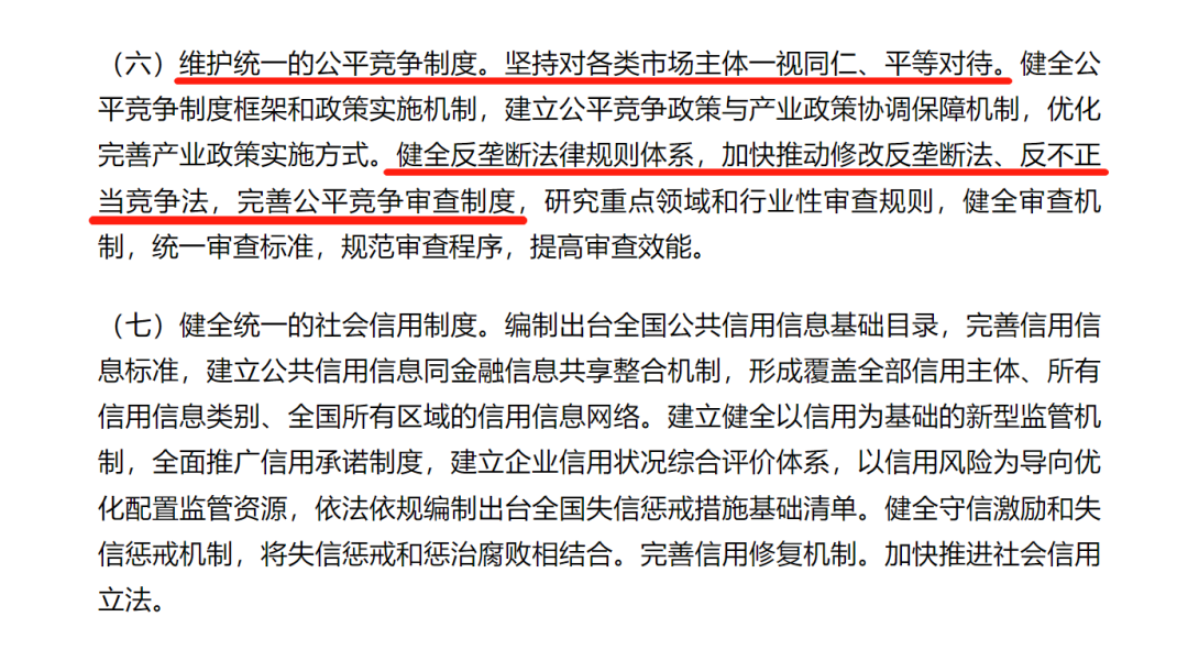 第六條的內容有兩點,前面是維護統一的公平競爭制度。堅持對各類市場主體一視同仁、平等對待。後面是健全反壟斷法律規則體系,加快推動修改反壟斷法、反不正當競爭法。這就是開頭説的,統一大市場,必然會秒殺一大批被地方保護的中小企業,就像這些中小企業十幾年前淘汰鄉鎮集市上的小商販。