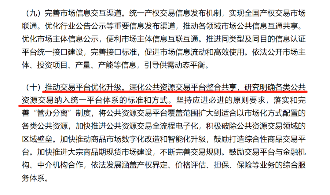 第十條,推動交易平台優化升級。這對企業來説是一條非常有價值的內容。因為後面有具體細則:加快推進公共資源交易全流程電子化,積極破除公共資源交易領域的區域壁壘。加快推動商品市場數字化改造和智能化升級,鼓勵打造綜合性商品交易平台。鼓勵交易平台與金融機構、中介機構合作,依法發展涵蓋產權界定、價格評估、擔保、保險等業務的綜合服務體系。
