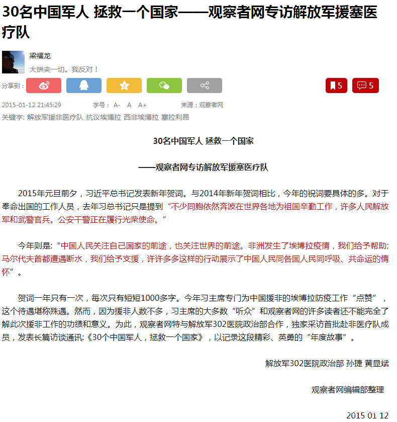 連花清瘟膠囊怎麼和埃博拉扯上關係的我不知道。但我是中國第一個採訪埃博拉病毒防治團隊的人。2014年,由解放軍302醫院派出的埃博拉防治醫療隊援助塞拉利昂,第一批團隊30人結束隔離,回到醫院舉行凱旋儀式的第二天,我就找到了他們的政治部,恰好遇到了隨隊去塞拉利昂的政工幹部黃顯斌。經他介紹,我採訪了醫療隊隊長李進、政治部副主任孫捷、醫療組組長秦恩強、外科負責人李志偉。後來在觀察者網發了特稿,標題是《30名中國軍人 拯救一個國家》。