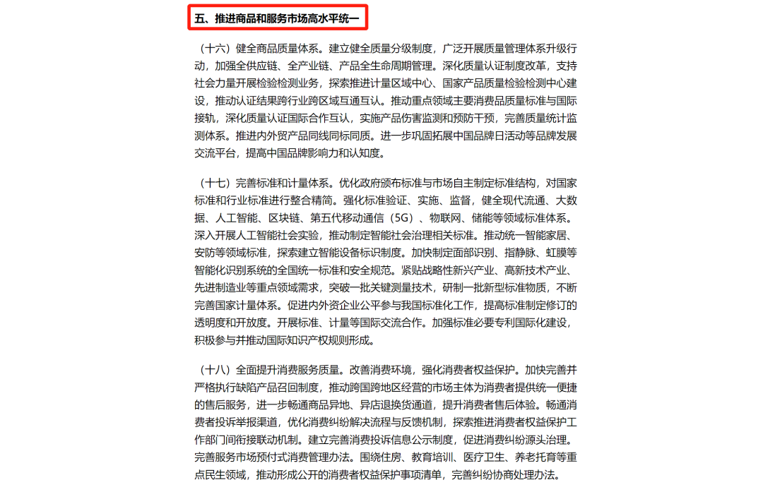 第五章包括16到18三個小標題,健全商品質量體系、完善標準和計量體系、全面提升消費服務質量。總的來説還是統一度量衡的延伸,裏面比較有新意的是兩個點。首先是“推進內外貿產品同線同標同質”,禁止企業再搞內外有別。像雲南白藥那種企業,在國內就標保密配方,在國外就公佈配方表,以後不能再允許了。