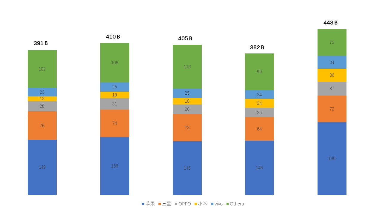 數據來源:Counterpoint OPPO數據包含一加手機 單位:十億美元 製圖:洞見新研社