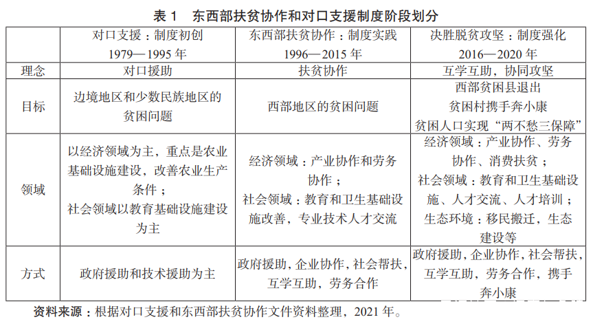 1.東西部扶貧協作制度的建立。1979年以來,對口支援的實踐為東西部扶貧協作制度的提出積累了經驗。鄧小平關於“兩個大局”的構想被寫入《中共中央關於制定國民經濟和社會發展“九五”計劃和2010年遠景目標的建議》,“堅持區域經濟協調發展,逐步縮小地區發展差距。改革開放以來,鼓勵一部分地區發展得快一些,先富起來,提倡先富帶動和幫助後富,各地經濟都有很大發展,人民生活水平都有很大提高”。沿海地區先發展起來並繼續發揮優勢,這是一個大局,內地要顧全這個大局。發展到一定時候沿海多作一些貢獻支持內地發展,這也是一個大局,沿海也要服從這個大局。“逐步縮小地區發展差距和解決好社會分配不公,最終實現共同富裕,是保持社會穩定的重要條件,是體現社會主義本質的重要方面。”1996 年中央扶貧開發工作會議決定,在全國開展東西部扶貧協作;同年召開全國扶貧協作工作會議,確定東部9個省市和4個計劃單列市對口幫扶西部10個省、區。這是黨中央、國務院按照鄧小平關於共同富裕的偉大構想,根據我國經濟社會發展的客觀需要所作出的一項重要決策。至此,中國初步形成了東西部扶貧協作和對口支援制度。