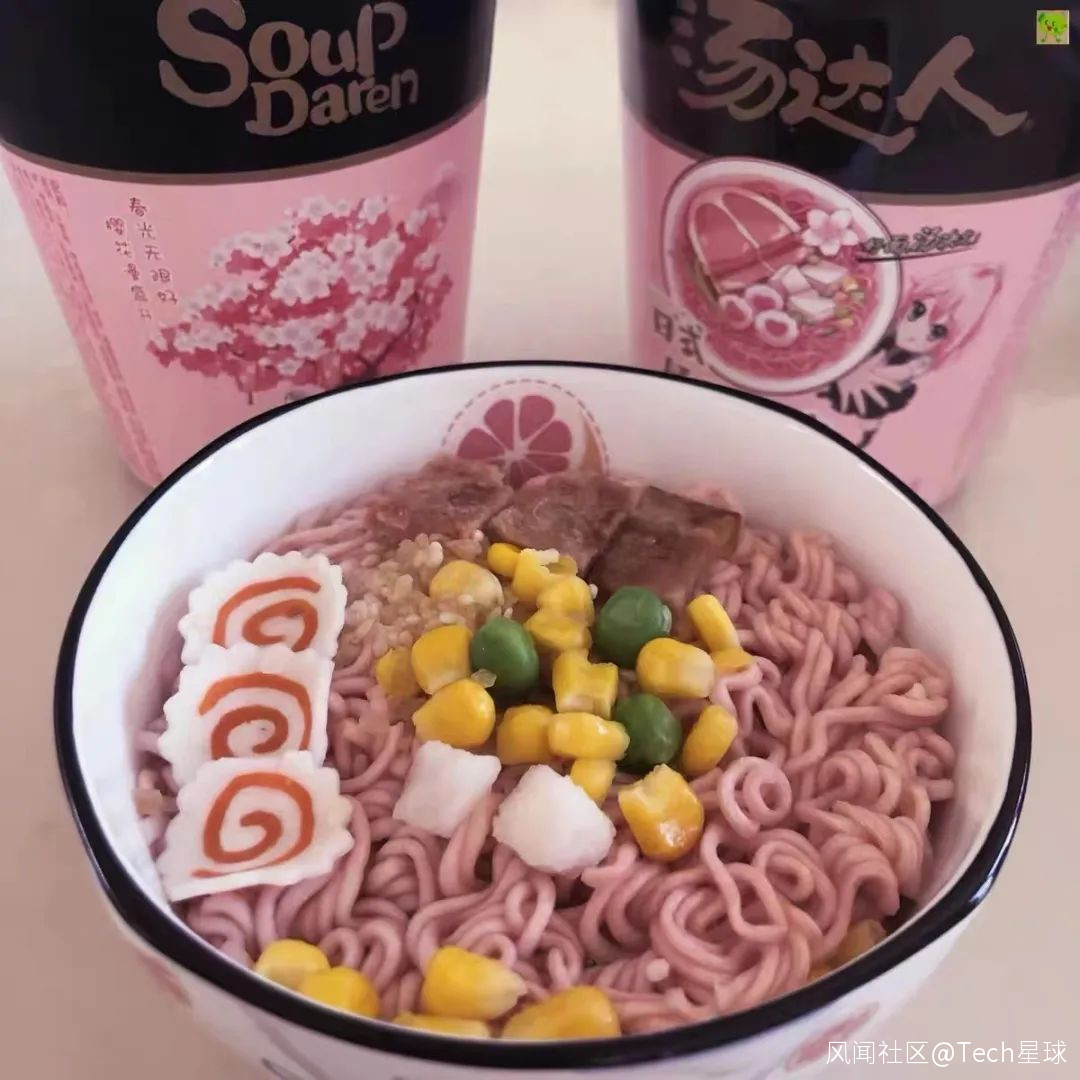 薯片也想蹭上這波行情,樂事推出櫻花蝦等三個口味的限定款。連泡麪品牌也推出春日櫻花限定,但櫻花風味並未體現在湯料裏,而是將麪餅染成了粉紅色。