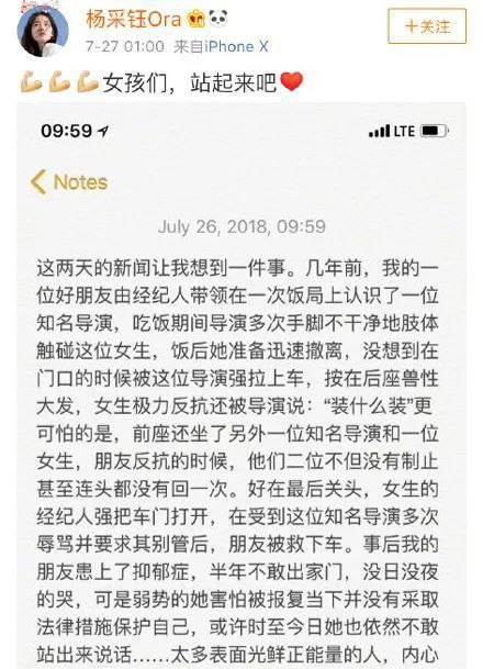 “有夢想的年輕人們,永遠不要接受強權的性騷擾要求,他們根本沒有任何權力,你不會因為順從得到工作,不會因為順從成名”。