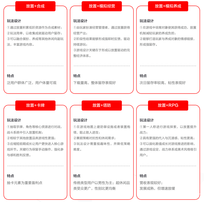 比如,下邊就是放置類遊戲各個細分類型在玩法設計上的具體建議——