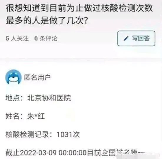 前兩天看到一個截圖,説是全球做核酸次數最多的人,一共做了1031次。
