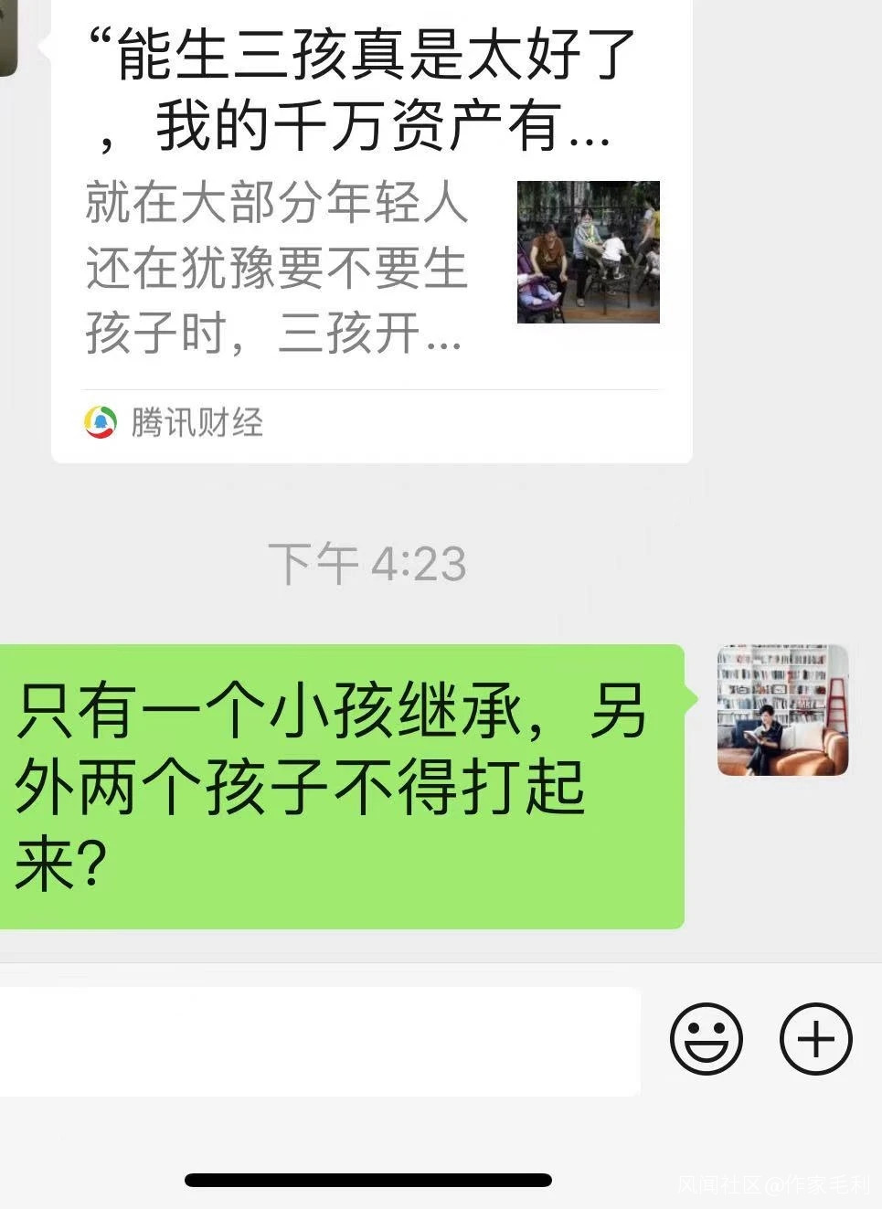 朋友給我看篇文章,“能生三個小孩實在太好了,我的千萬資產有人繼承了”,這是有錢人的思路,要找個繼承人。