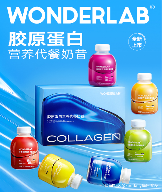 4月20日,WonderLab推出新品膠原蛋白營養代餐奶昔,甄選恆天然牛奶蛋白MPC70搭配德國進口乳清蛋白WPC80與精選非轉基因大豆分離蛋白SPI90 3重優質蛋白,每瓶含蛋白質25g,飽腹感更持久;還特別添加5000mg德國嘉利達專利成分膠原蛋白,全方位撐起肌膚;使用麥芽糖醇、甜菊糖苷代替蔗糖添加,整體降甜約1/3;每瓶超10g膳食纖維、大小果粒添加口感更豐富,共有木瓜輕牛乳、滿瓶金菠蘿、樹莓石榴多味、芒芒黃桃奶味、啵啵甜葡萄、牛油果生椰6種口味,天貓旗艦店活動價75g*6瓶/159元。