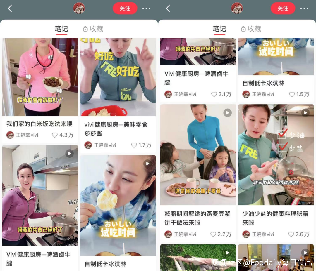 俗話説三分練七分吃,在劉畊宏在自己的賬號中分享運動健身內容的同時,王婉霏則開始在自己的小紅書賬號上分享起了“vivi健康廚房”系列,介紹一些少油少鹽、低卡美味的健康料理及輕食。