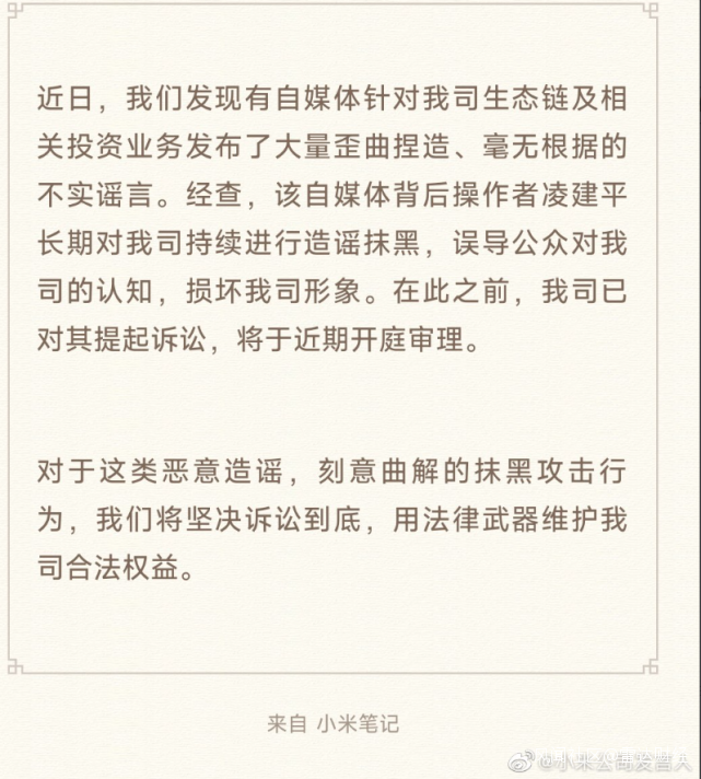 此前的3月29日,“小米公司發言人”發微博稱,“近日,我們發現有自媒體針對我司生態鏈及相關投資業務發佈了大量歪曲捏造、毫無根據的不實謠言。”