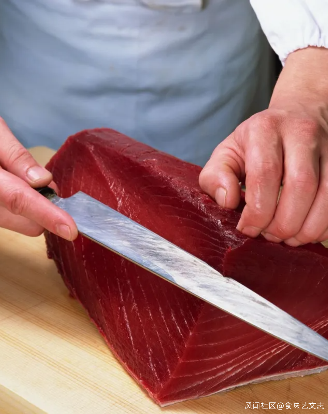 執刀廚師先用刀從魚的胸鰭下刀,然後再從魚的側面發力,沿着金槍魚的側面將魚身分割開,並將骨肉進行分離。最後,按部位分開,分割成長條塊,按照客人的食量和器皿的形狀,切成小片或小塊。