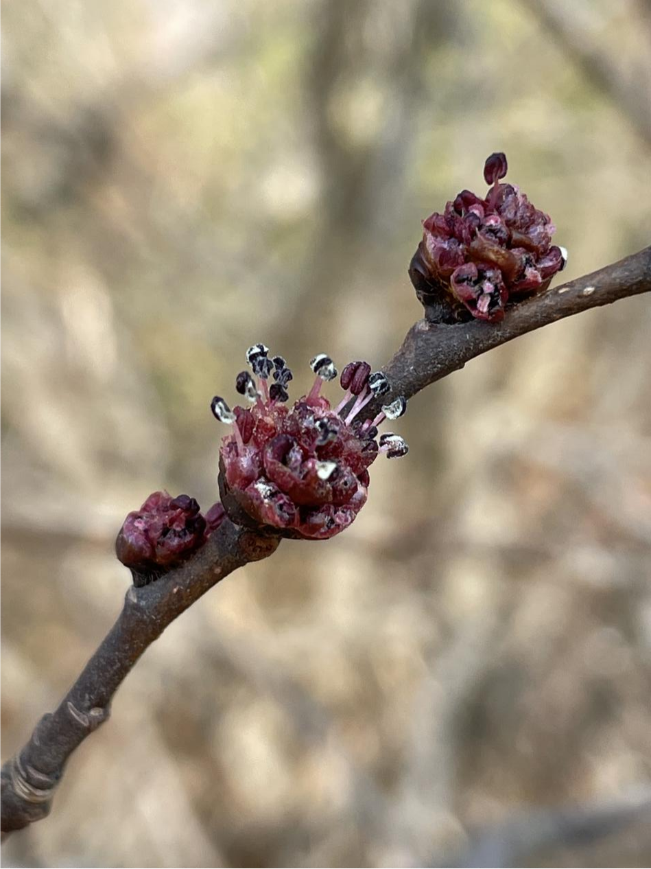 長得小就算了(上圖是放大了拍的),還不起眼,紫褐色的花幾乎和樹的枝幹融為一體,生怕被別人瞧見了!開花的時候還沒開始長葉子,一簇簇生長在葉腋,不仔細看還以為榆樹還在冬眠沒有睡醒呢!又加上花期不長,所以儘管榆樹遍佈黃河流域至華北平原,人們卻很少注意到它的花。