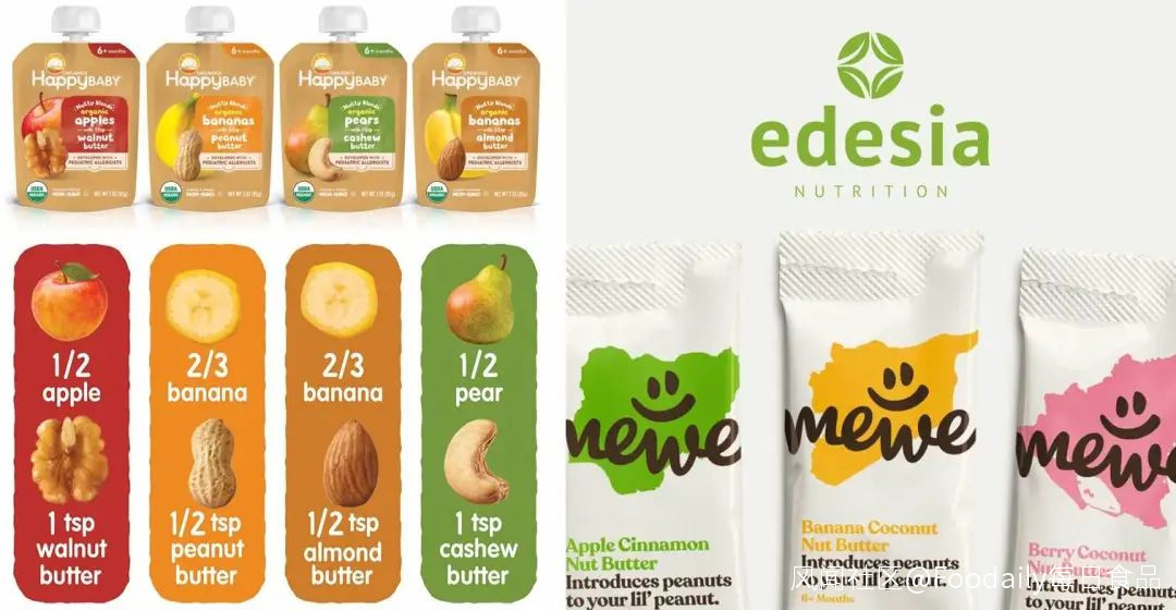 眾所周知,嬰幼兒和兒童是食物過敏的高發羣體。與以往遠離過敏原的解決思路不同,近年來營養學界越發趨向於將解決辦法“前移”到嬰兒階段。與國內相比,海外上市的嬰幼兒食品中,添加過敏原食物的比例逐年提高。比如美國嬰兒食品品牌happy Family,MeWe等就在產品中添加花生、腰果等堅果成分,幫助寶寶提早適應過敏食物,減少後期過敏症狀的發生率。