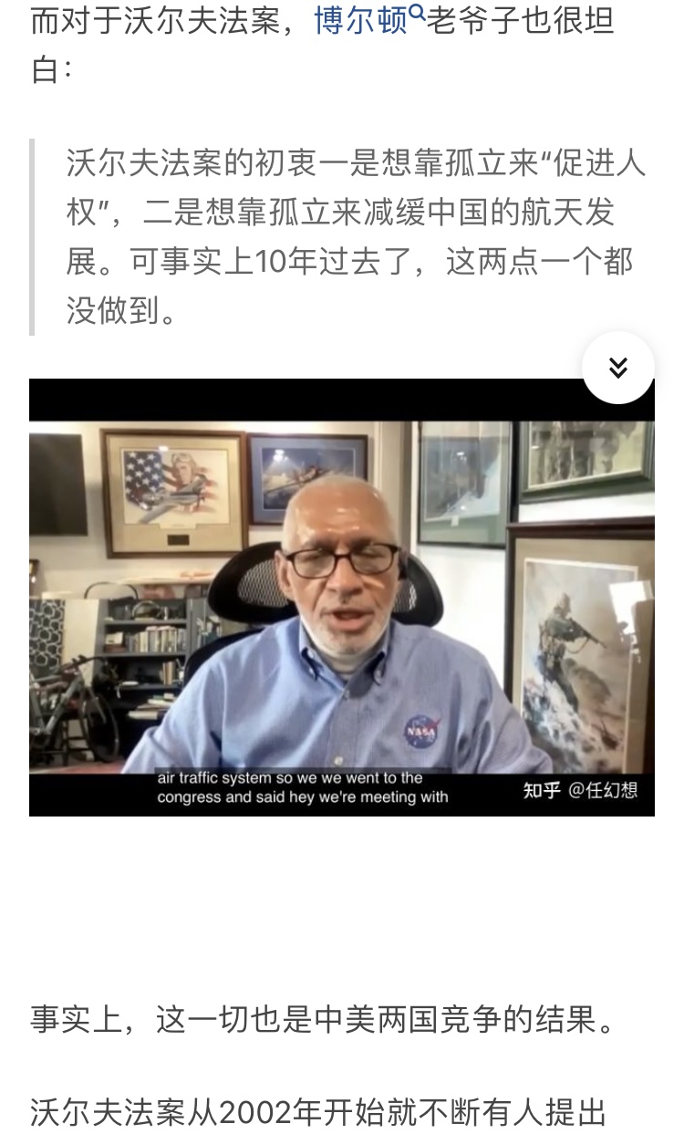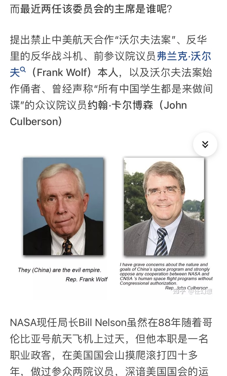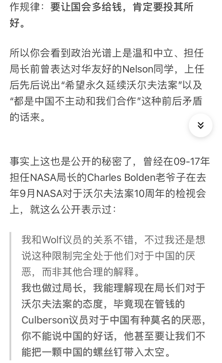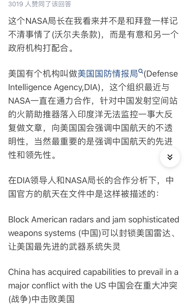 看到點贊數比較高的答主認為NASA局長此次避而不談沃爾夫條款不是忘記了,而是在和美國國防情報局打配合。