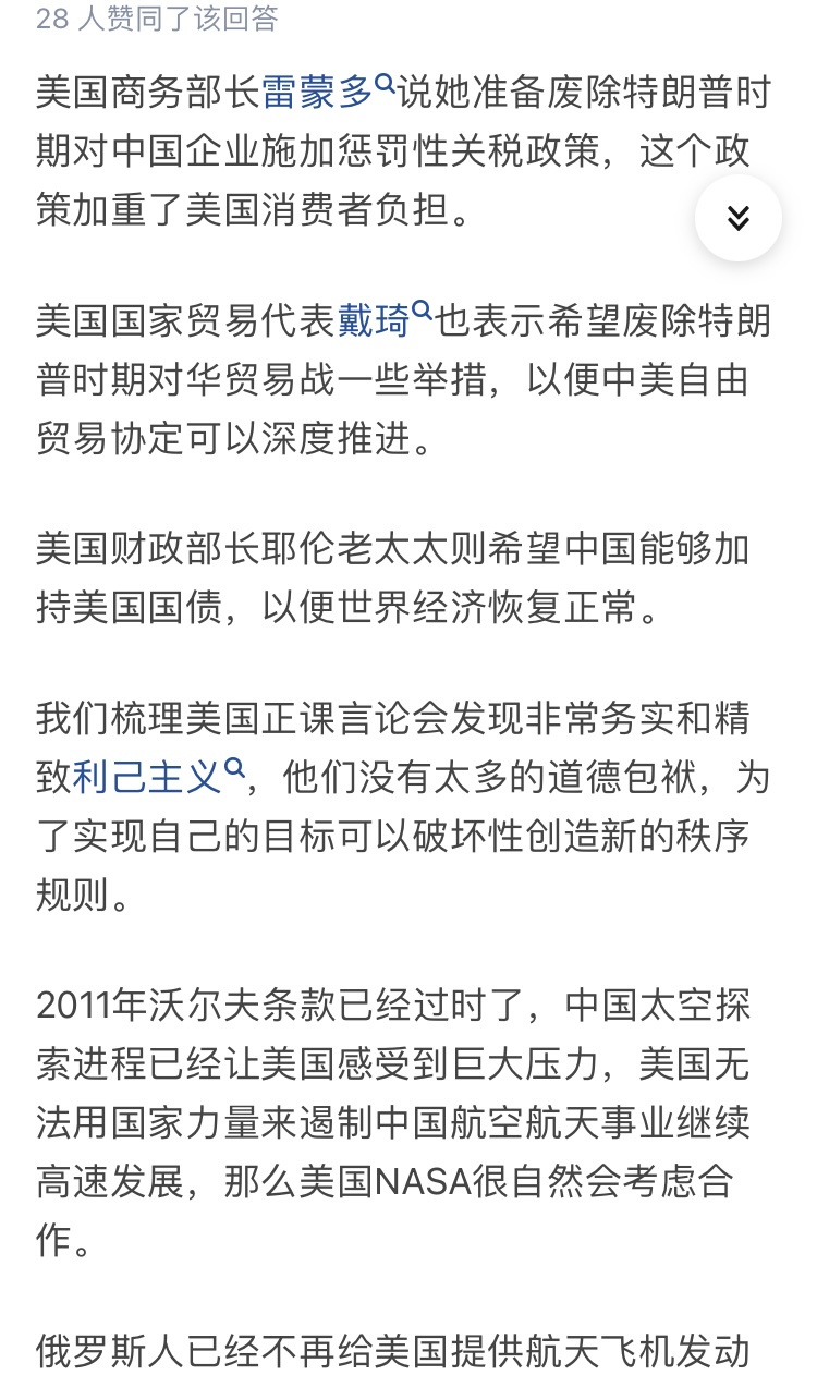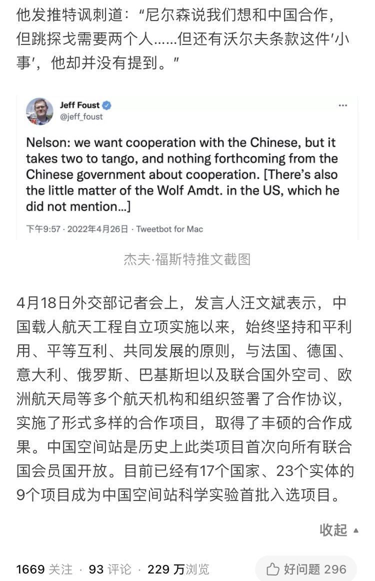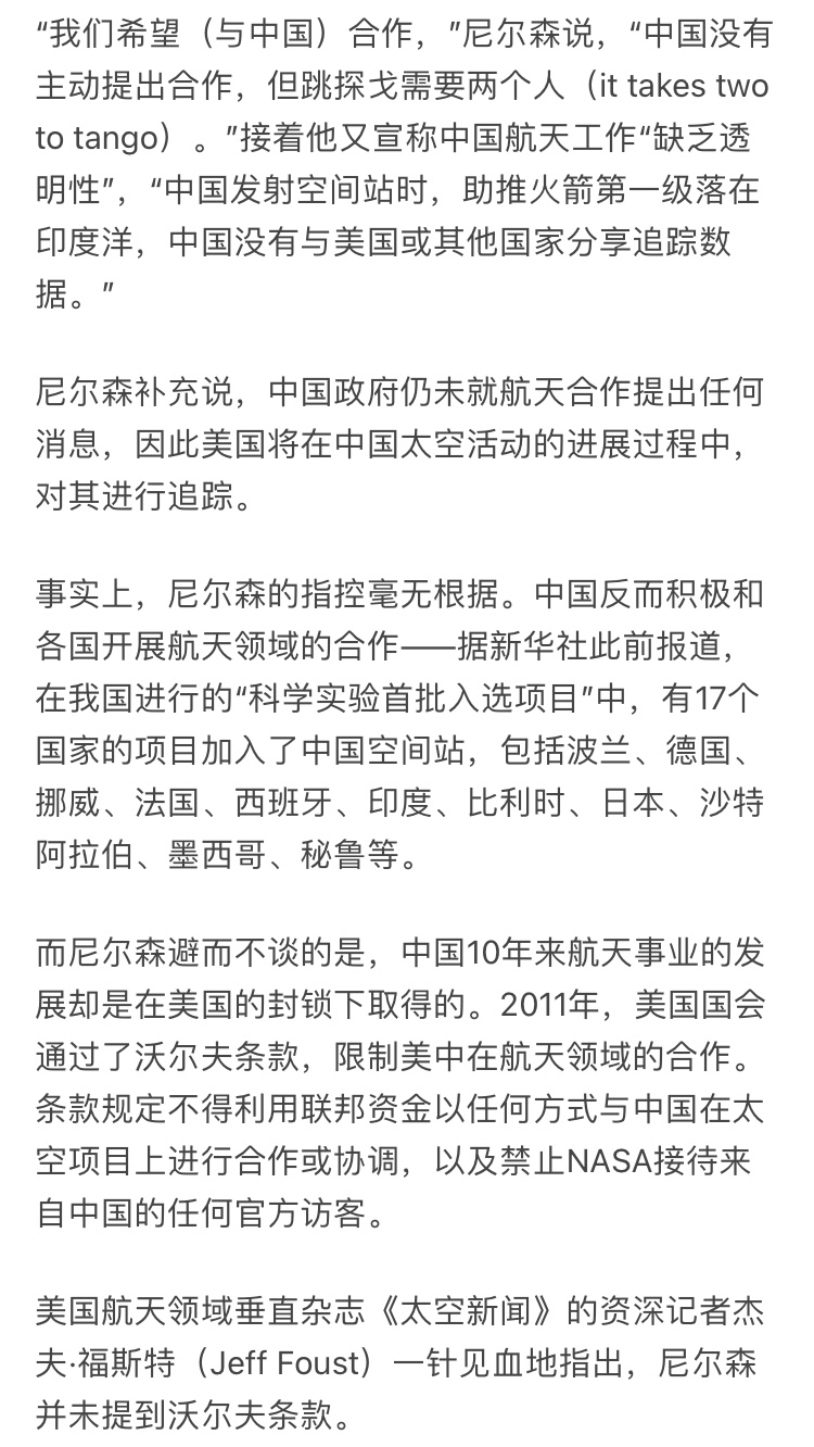 看到點贊數比較高的答主認為NASA局長此次避而不談沃爾夫條款不是忘記了,而是在和美國國防情報局打配合。